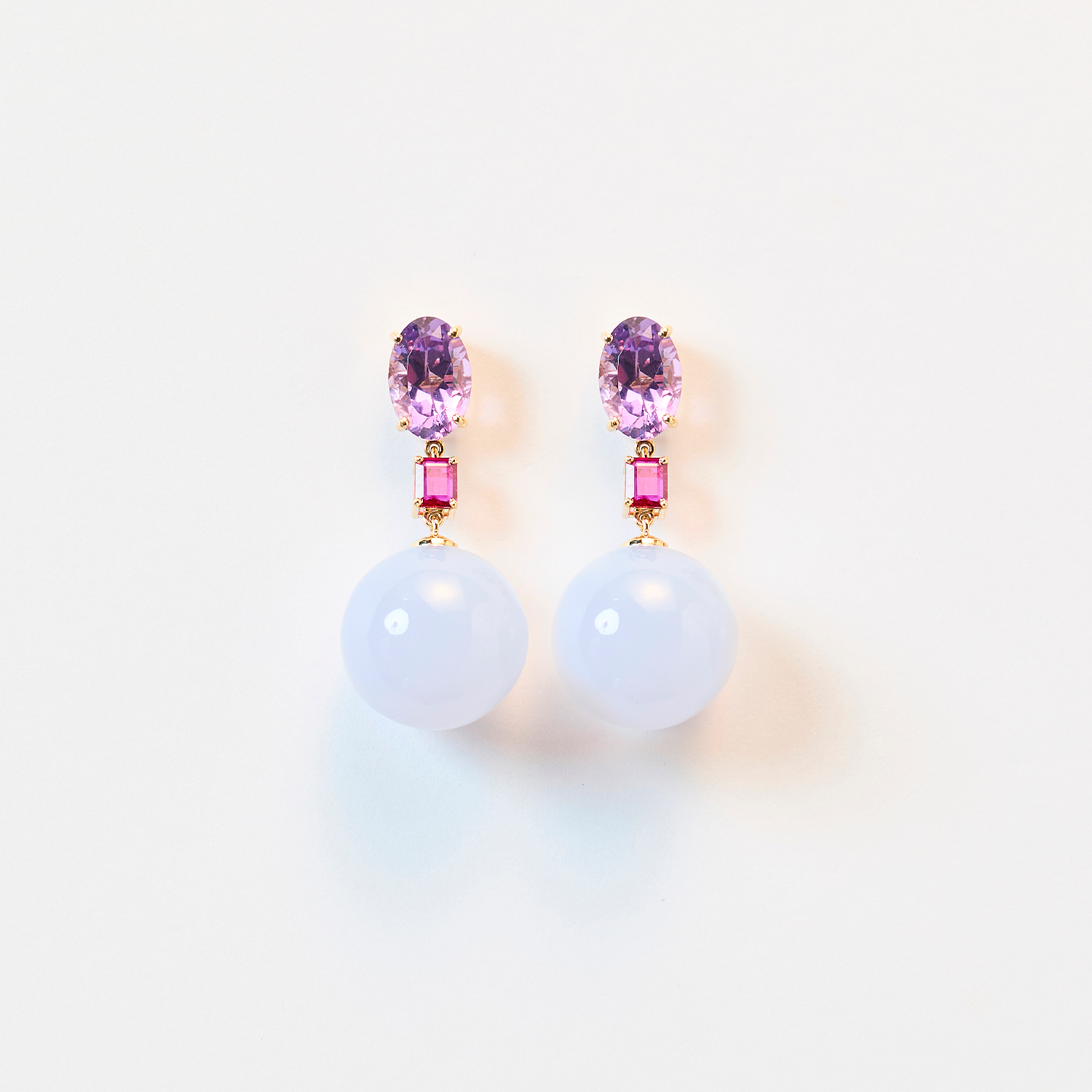 Custom-cut oversized balls anchor (figuratively and literally!) our Bonbon earrings. In our Chalcedony pair, we work with contrasts, its pastels challenge the vividness of rubies and amethysts, and then there's the hide and the seek of opaqueness and lustre between the gems. For those who like their gems with a sense of play.