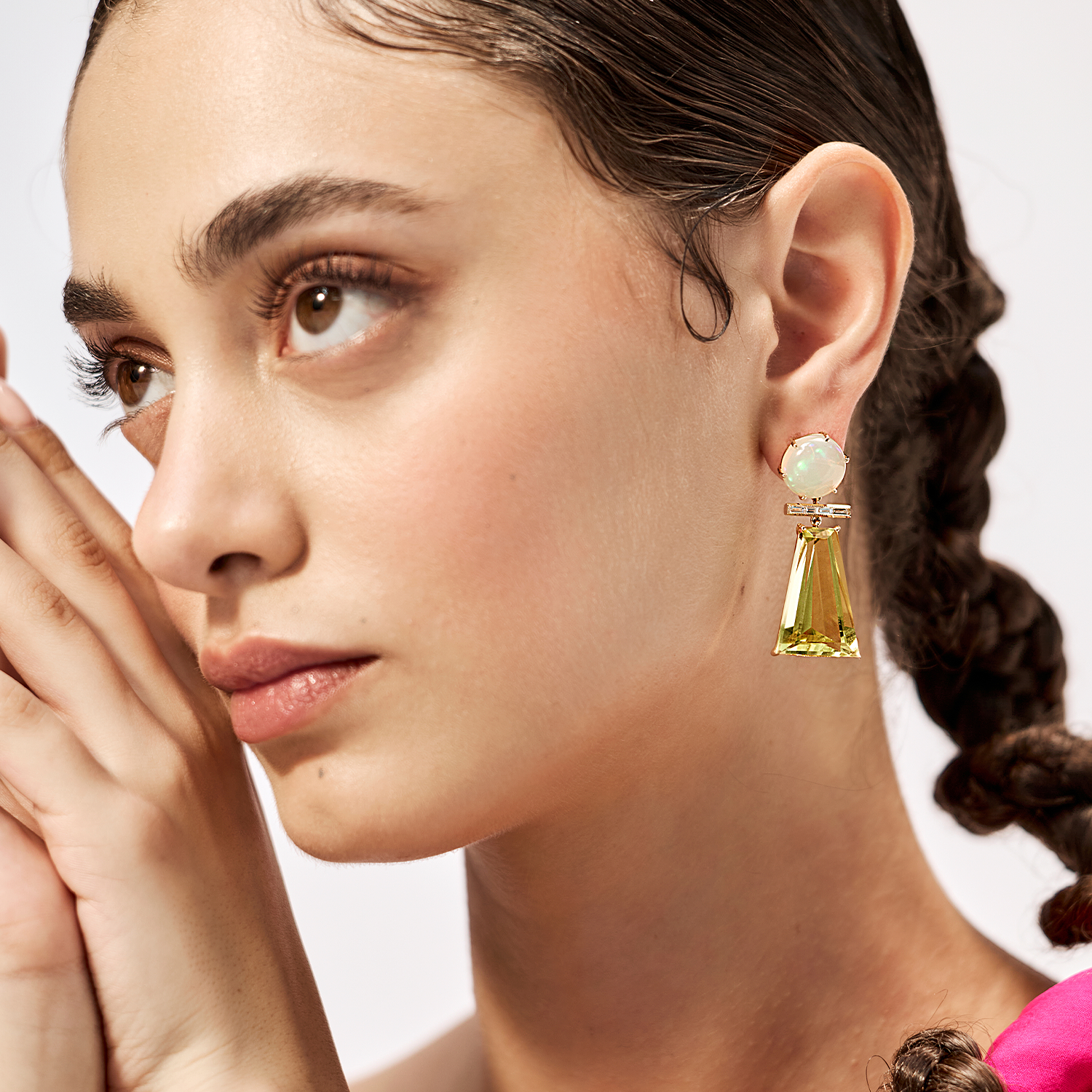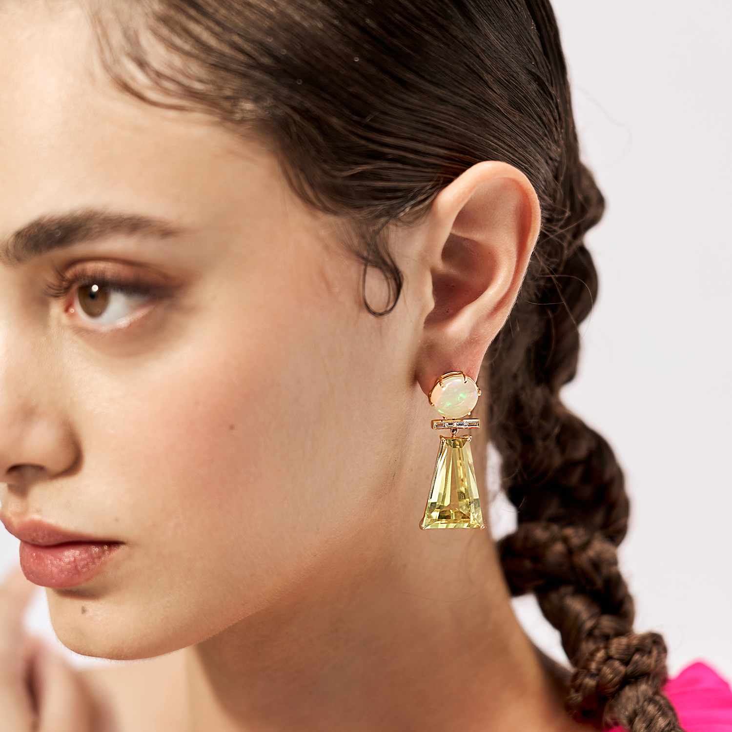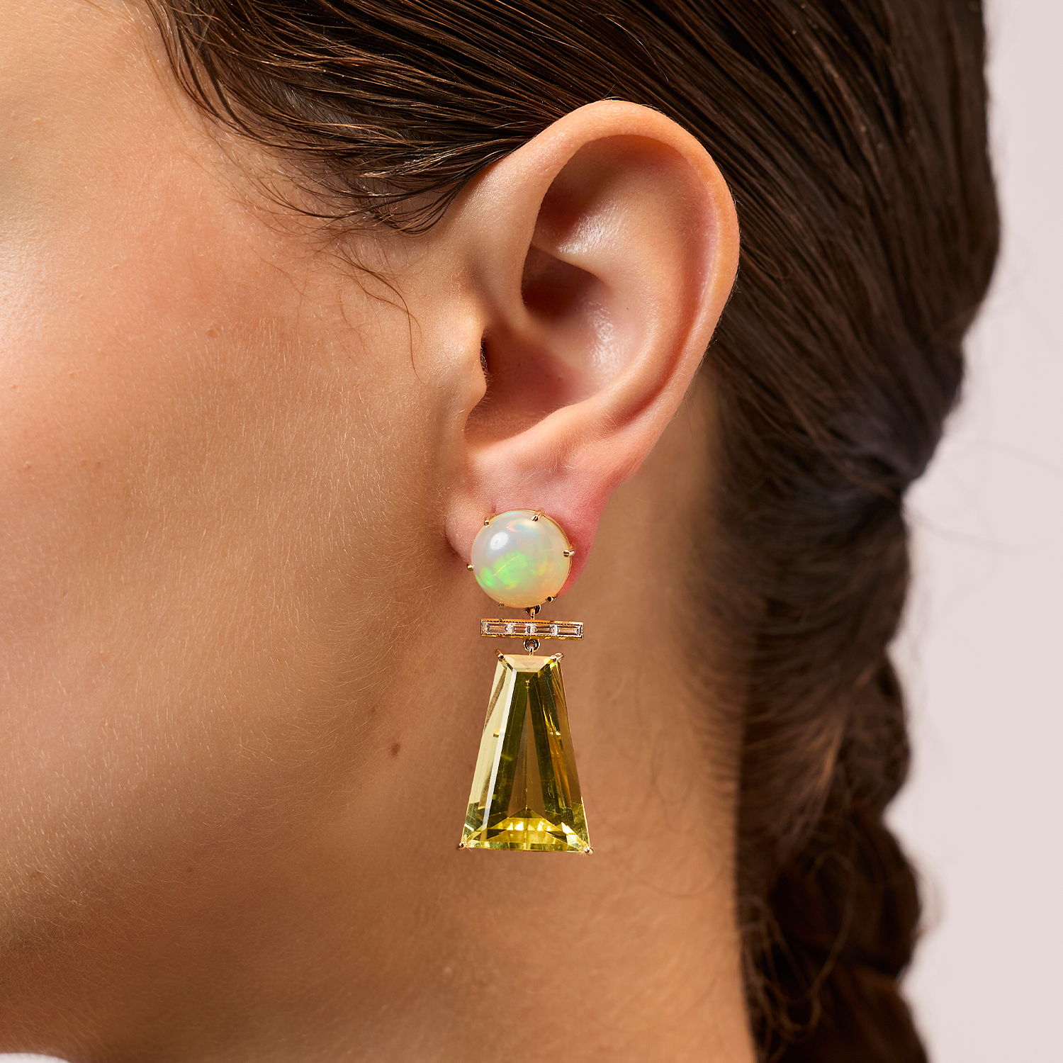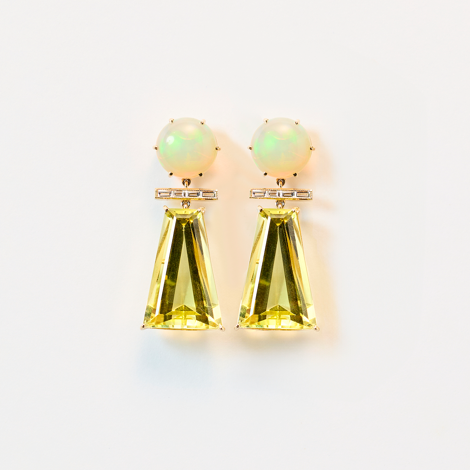 The pure, poetic brilliance of a lemon quartz pair, heartstopping in itself, lit up further with a pair of round opals, both a complement and a contrast. Finished off with our signature bar, in baguette-cut diamonds.